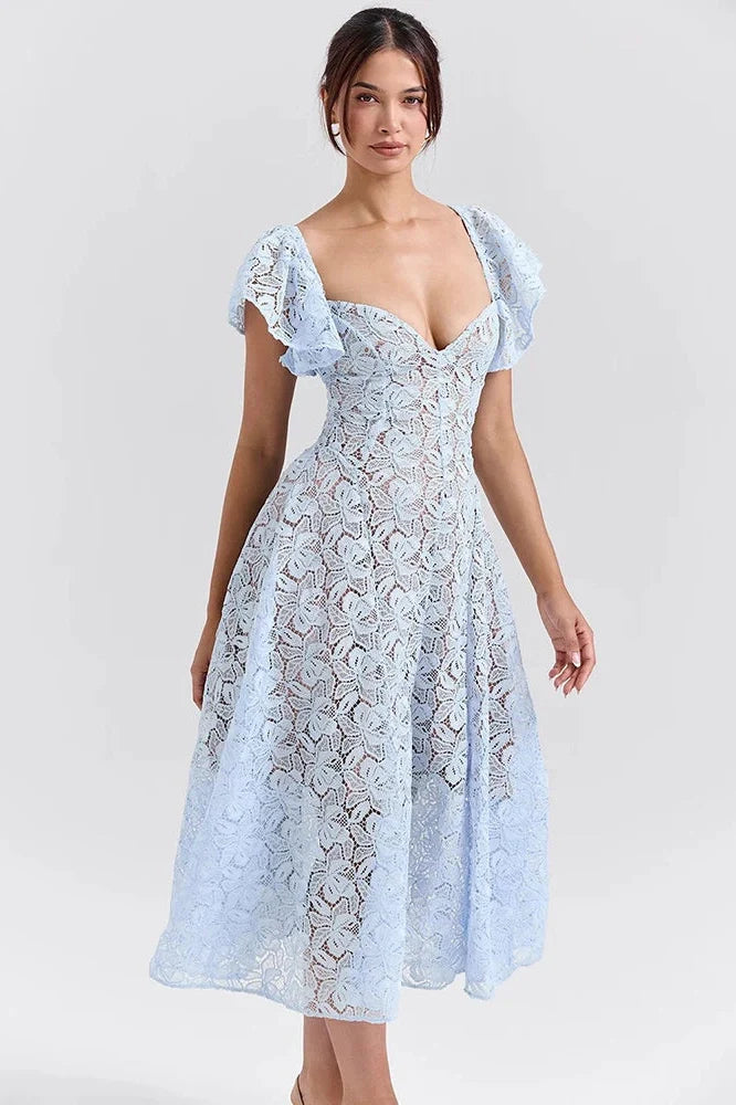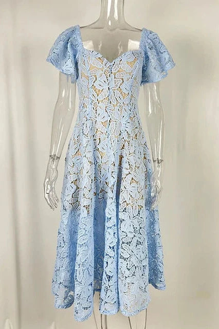 Embrace sophistication in this exquisite backless midi dress, featuring a delicate floral lace design and a stylish square collar. Ideal for special occasions!