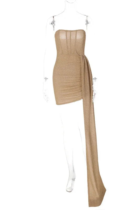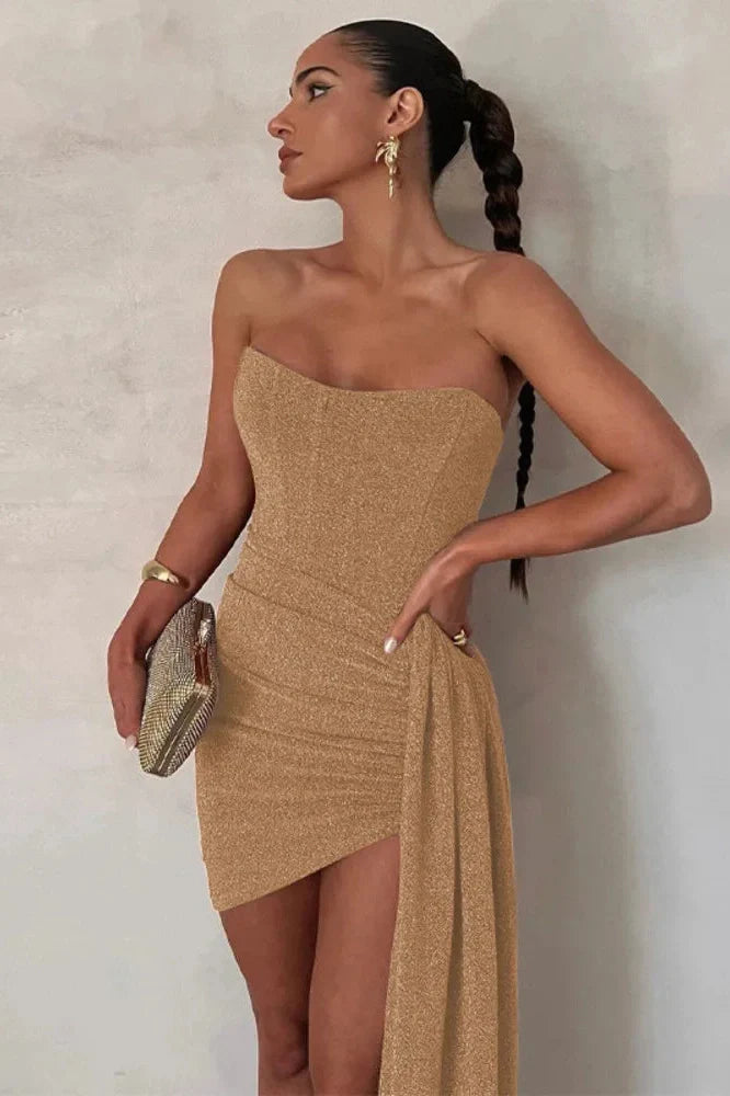 Elevate your style with this stunning mini dress, featuring a sparkling glitter finish, a flattering V-neck, and a chic side slit. Perfect for any occasion!
