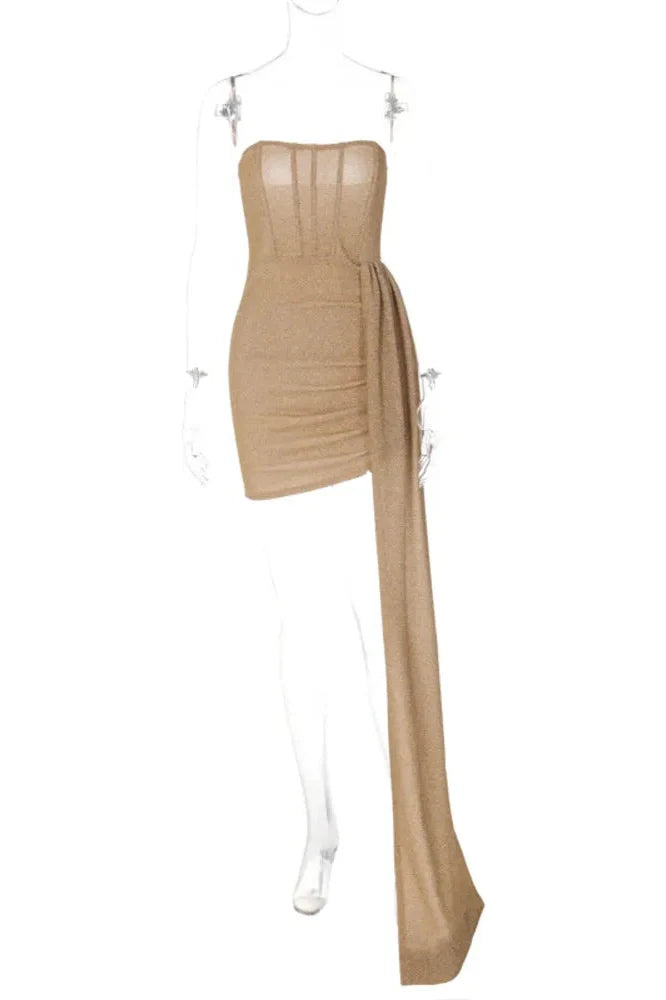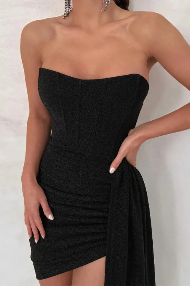 Make a bold statement in this chic A-line mini dress, featuring an off-shoulder strapless design and a stunning backless silhouette. Perfect for any fun outing!